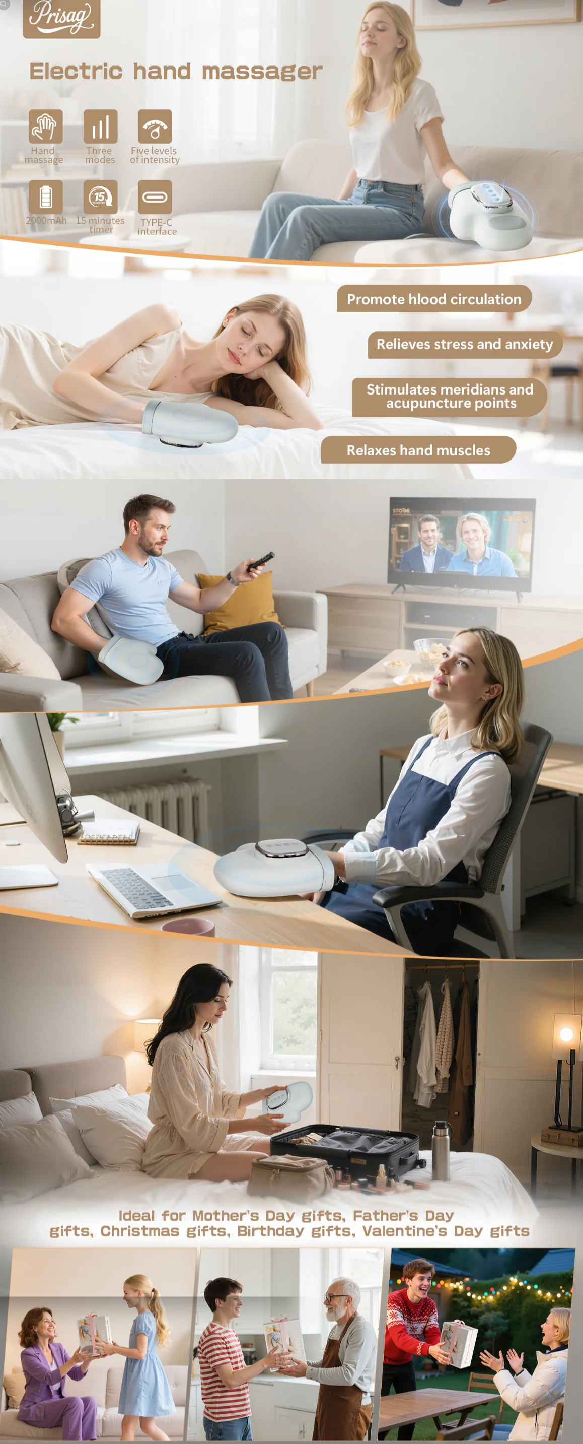 【Rechargeable and Portable】Say goodbye to frequent charging, our hand massager equipped with a 2000 mAh battery, Type C quick interface, It only needs to be charged , great for consistent daily use at home, in the office, or while traveling